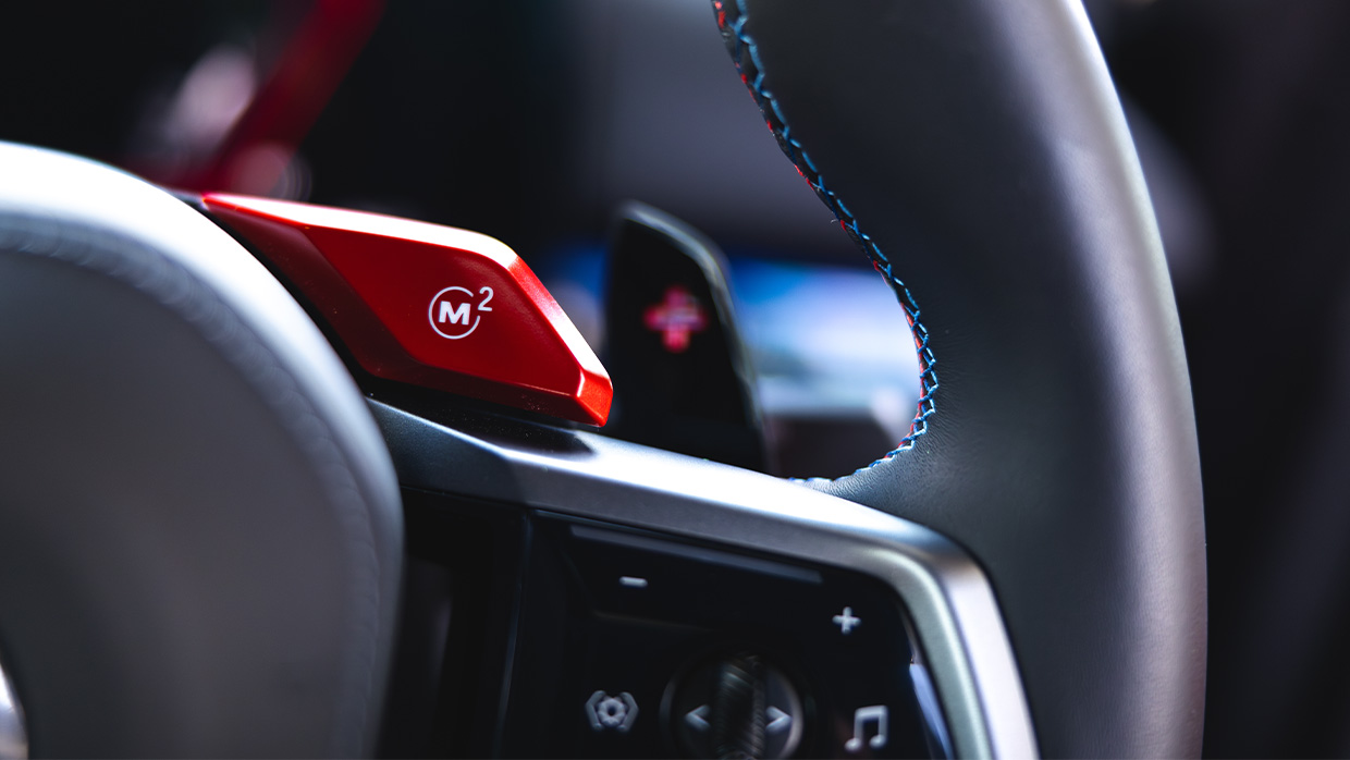 Es gibt mehr Rot am Armaturenbrett und das Lenkrad – für einen Mittelstreifen sowie (wieder) zwei -m -Modus -Verknüpfungsknöpfe.