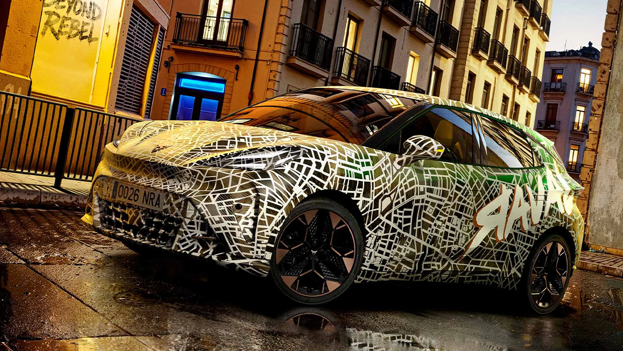 Der Raval behält die dreieckigen Scheinwerfer des Rebellen bei, die ein Cupra -Motiv im Inneren haben. Auf der Rückseite ist eine hintere Hecklichtstange in voller Länge zu sehen, die mit einem integrierten Cupra -Abzeichen eingebaut ist.