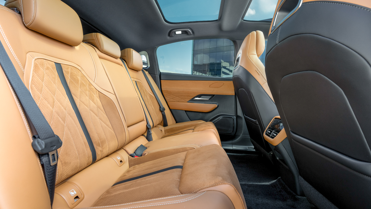 • Sitze aus hellbraunem Leder und synthetischem Wildleder mit Steppnähten