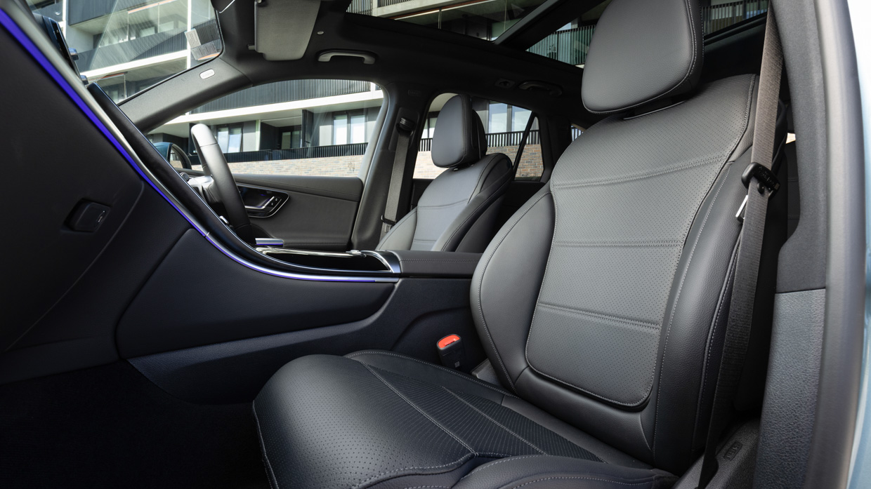 Die hochgradig verstellbaren und beheizbaren Vordersitze mit Artrico-Bezug (Kunstleder) fühlen sich angenehm an und sind auf kurzen Fahrten bequem. Nach einer langen Fahrt wünschten wir uns jedoch mehr Unterstützung in der Mitte des Rückens, und eine Sitzkühlung wäre eine schöne Ergänzung, wenn wir in die Sommermonate starten.
