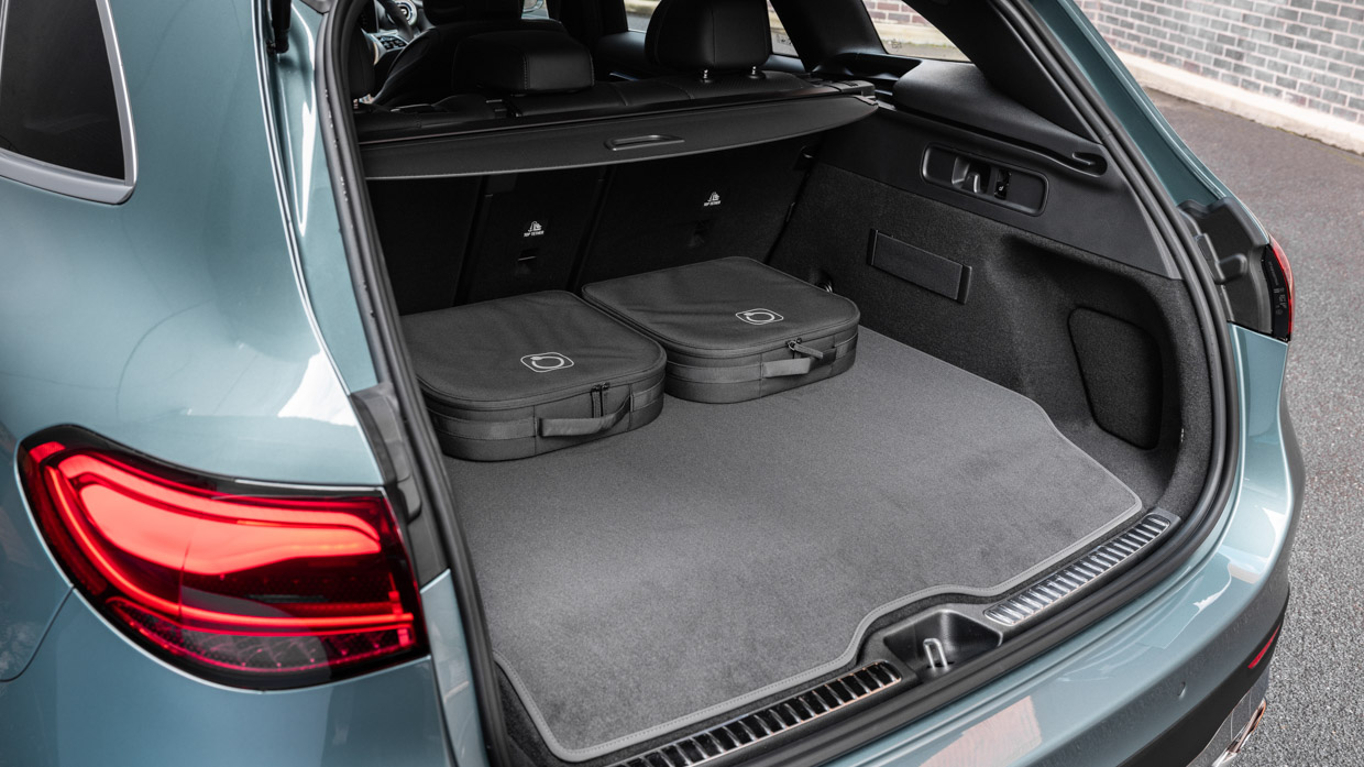 Durch das Anbringen eines 25-kWh-Batteriepakets über der Hinterachse kam es zu einem gewissen Eingriff in den Kofferraum des GLC, so dass der Boden nicht mehr ganz eben ist und es keinen Stauraum unter dem Boden gibt. In Bezug auf die Gesamtgröße misst er jedoch 590 l gegenüber 620 l beim GLC 300.