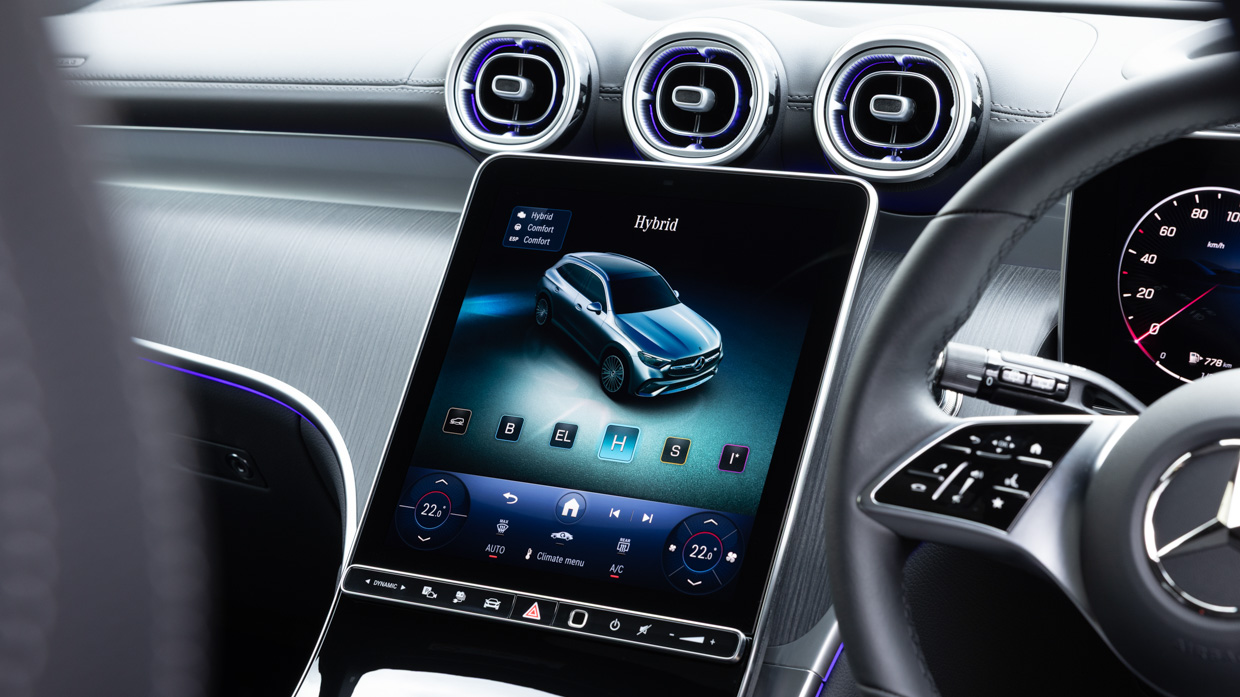 Der Innenraum des GLC 350e ist optisch vielleicht nicht so beeindruckend wie der 40-Zoll-Bildschirm der kommenden GLC-Elektrofahrzeuge, aber isoliert sieht er dennoch recht modern aus.