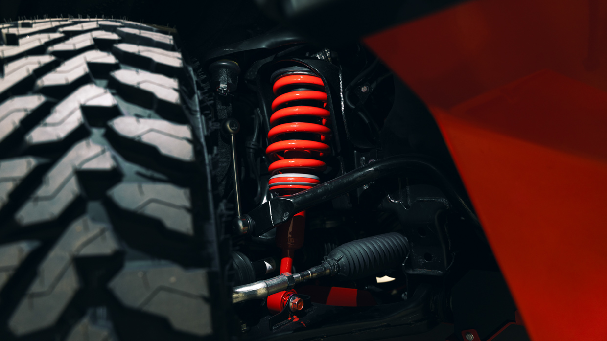Das Konzept fügt hinzu: angehobene Fahrhöhe mit spezifischer Fahrwerksabstimmung, mit vorderen Schraubenfedern und Dämpfern in Lavarot sowie einer breiteren Spur durch den Einbau von 17-Zoll-Räder mit verändertem Offset. Als Gummi wählt man riesige 32,2-Zoll-Geländereifen.