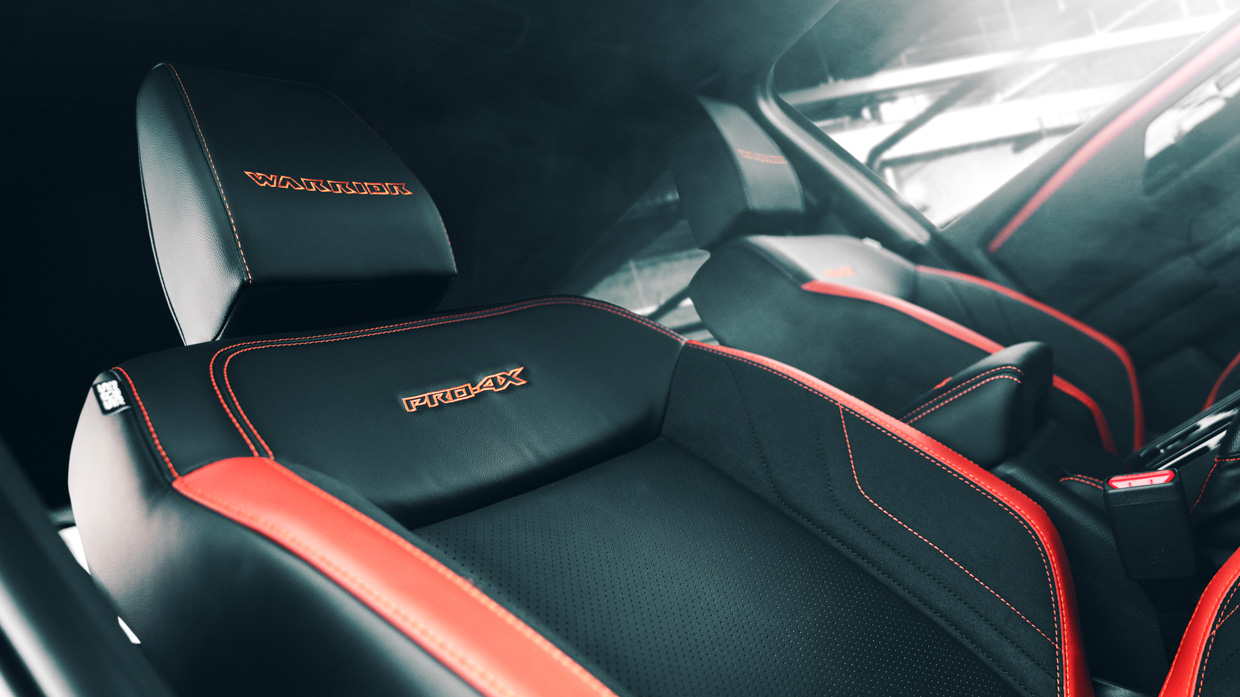 Zu den weiteren Design-Optimierungen gehören Warrior-Seitentüraufkleber, lavarote Elemente in den Kotflügelverbreiterungen, eine Wannenauskleidung, ein Heckklappen-Assistenzmechanismus, ein maßgeschneidertes Pro-4X-Segelflugzeug und verschiedene andere Warrior-Branding-Akzente.