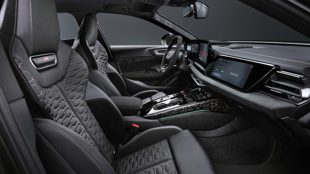 Im Inneren präsentiert ein 14,5-Zoll-OLED-Touchscreen kabellose Apple CarPlay/Android Auto- und Audi Driving Experience-Seiten mit automatischer oder manueller Streckenkartierung und Pilotenanalyse.