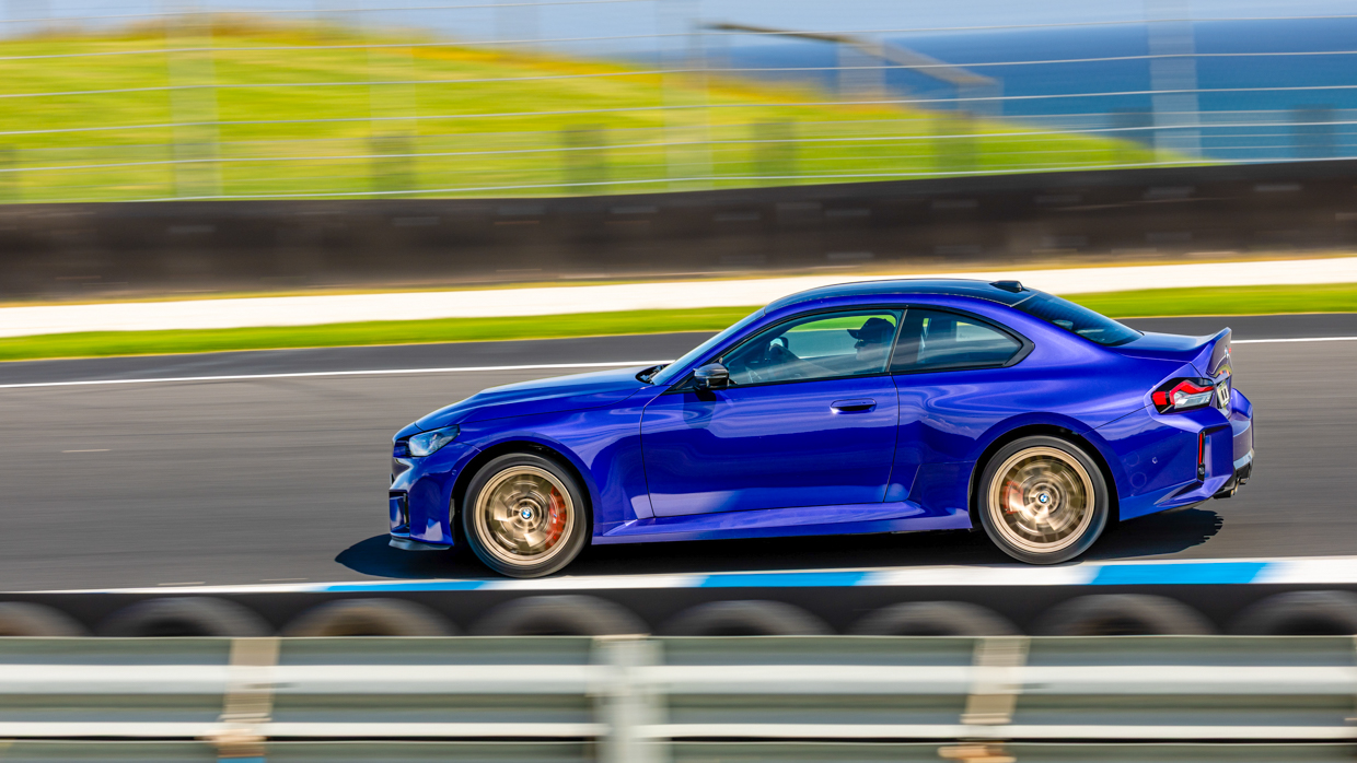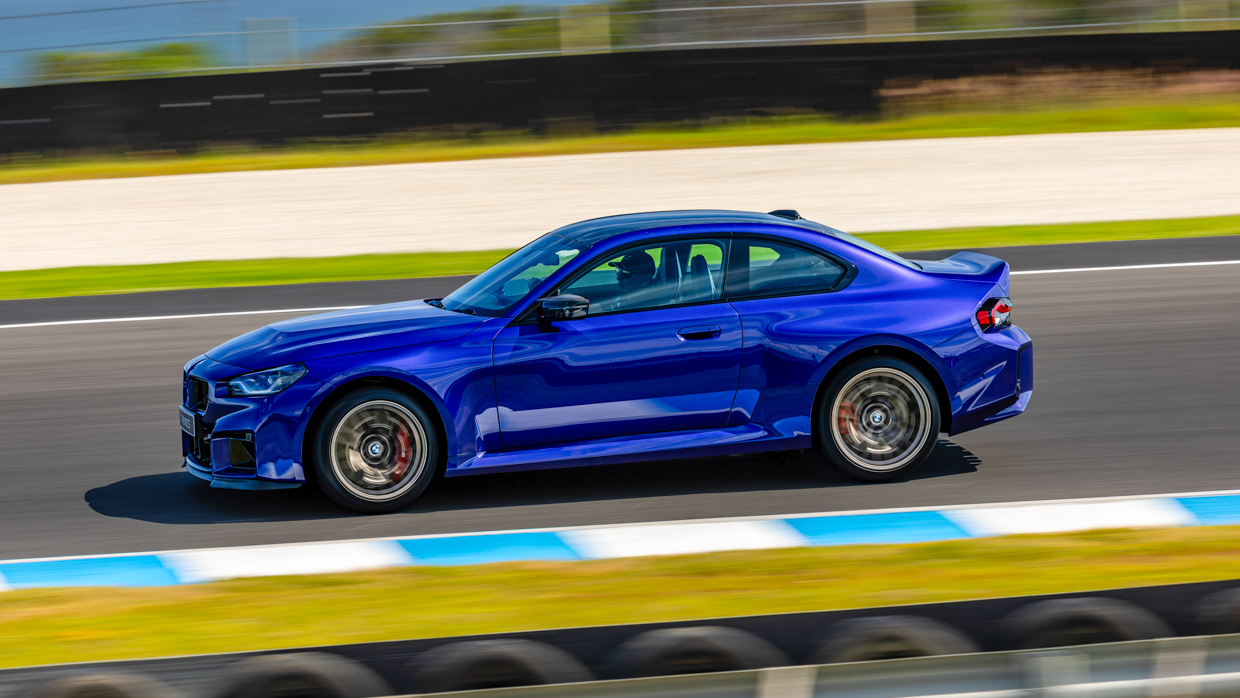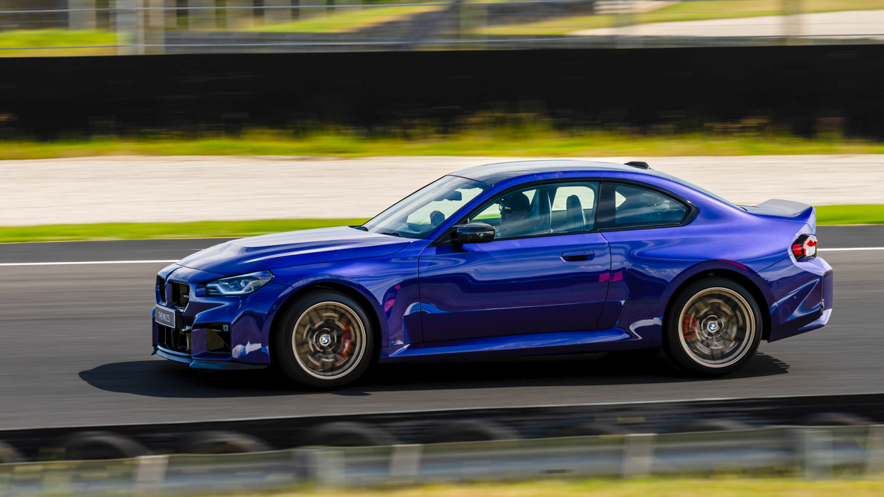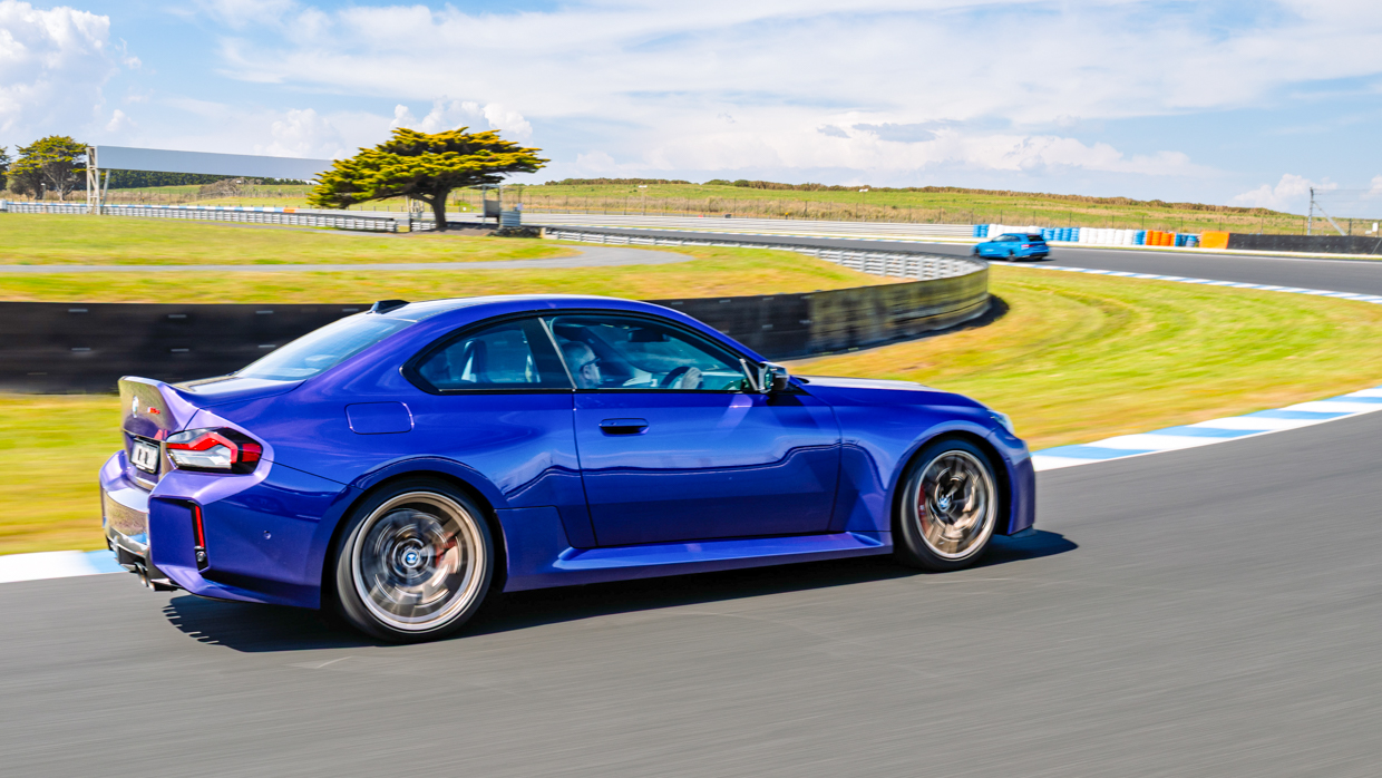 Als der M2 CS mit eingeklemmtem rechten Fuß die Gegengerade hinauffährt, bleibt sein DSC hängen, während er leicht über einen Buckel fährt, während er im sechsten Gang kräftig schleppt, was weit über 200 km/h bedeutet – was den größten Unterschied zwischen dem 390 kW starken M2 CS mit Heckantrieb und seinem größeren 405 kW starken M4 CS-Cousin verdeutlicht.