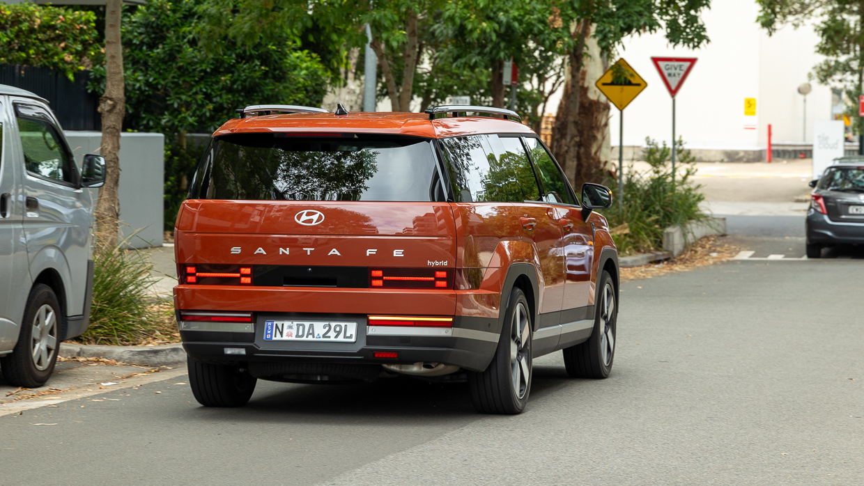 Unser Tester sieht das Auto im kostenlosen Terrakotta-Orange – einige Farben kosten 750 US-Dollar Aufpreis – und den wohl schönsten Legierungen der Santa Fe-Reihe. Der serienmäßige Innenraum in Obsidianschwarz kann für einen Aufpreis von 250 US-Dollar in ein helles Supersonic-Grau-Design „gehievt“ werden.