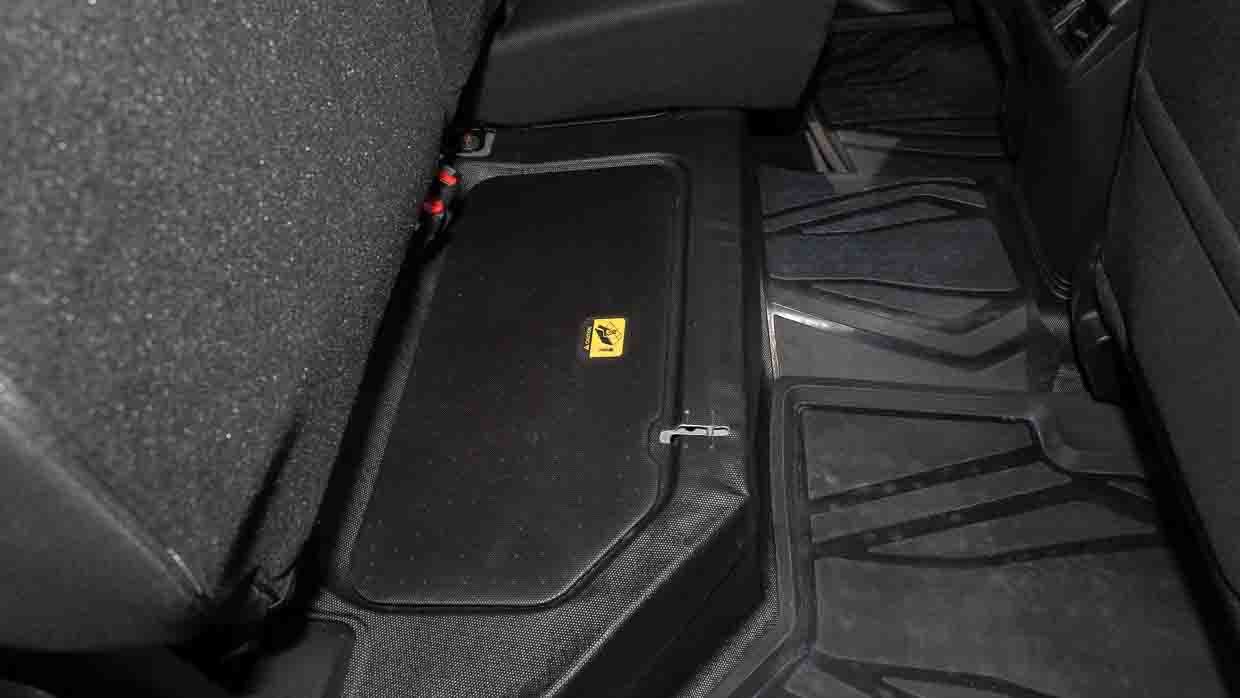Auch für die Insassen der zweiten Reihe ist es ziemlich zurückhaltend. Für meine Körpergröße von 175 cm ist es etwas matschig, aber für die Kinder wäre es völlig in Ordnung. Ein USB-C-Anschluss, hintere Lüftungsschlitze, Zeitschriftenhalter und ein Kleiderhaken sowie eine herunterklappbare Armlehne mit zwei Getränkehaltern sind ebenfalls vorhanden.
