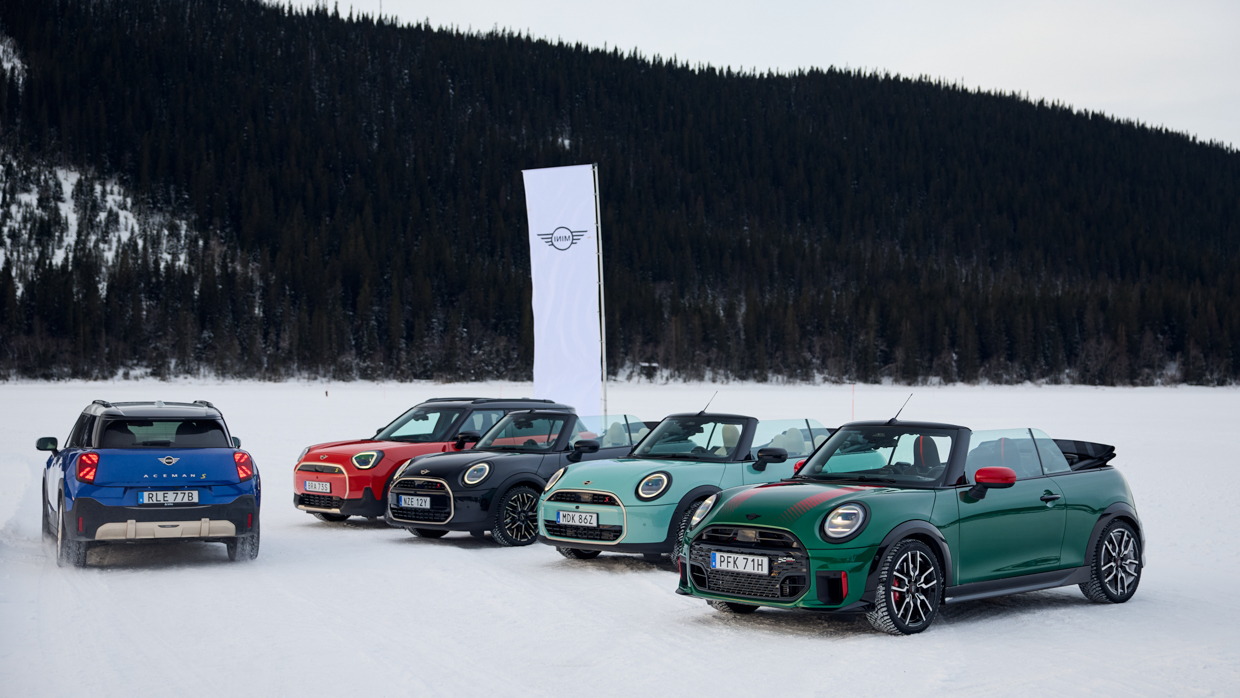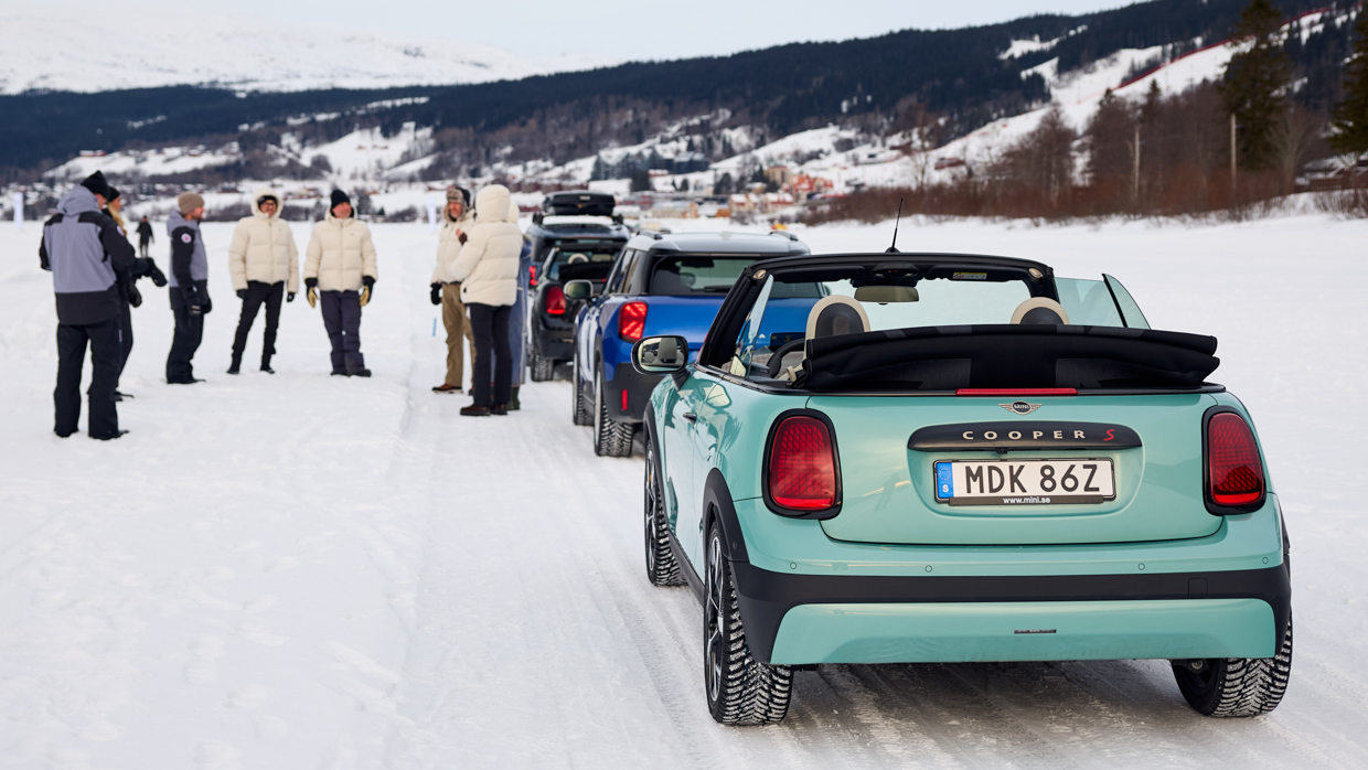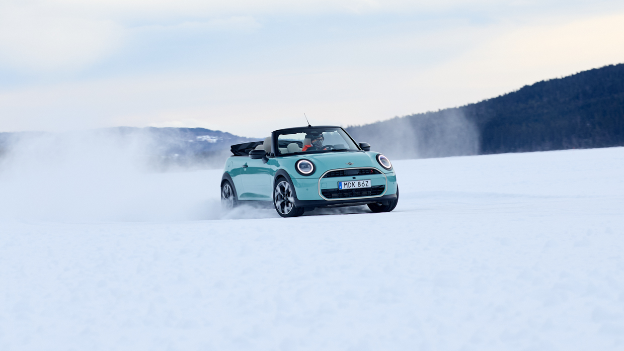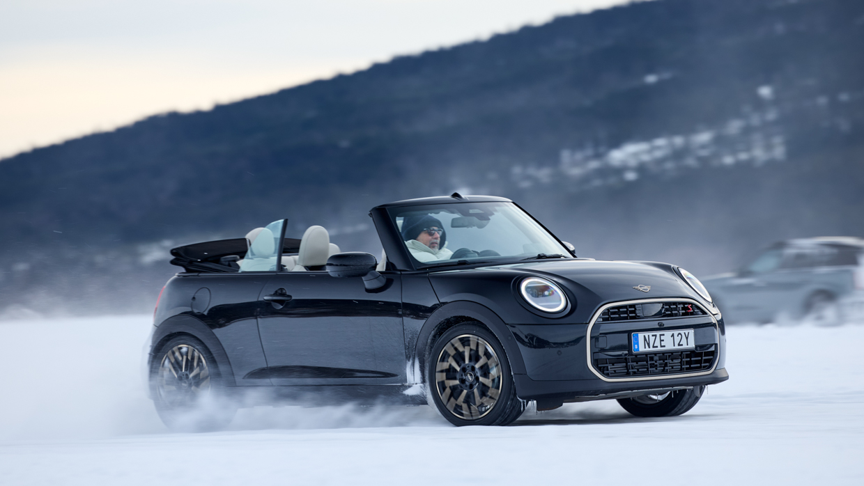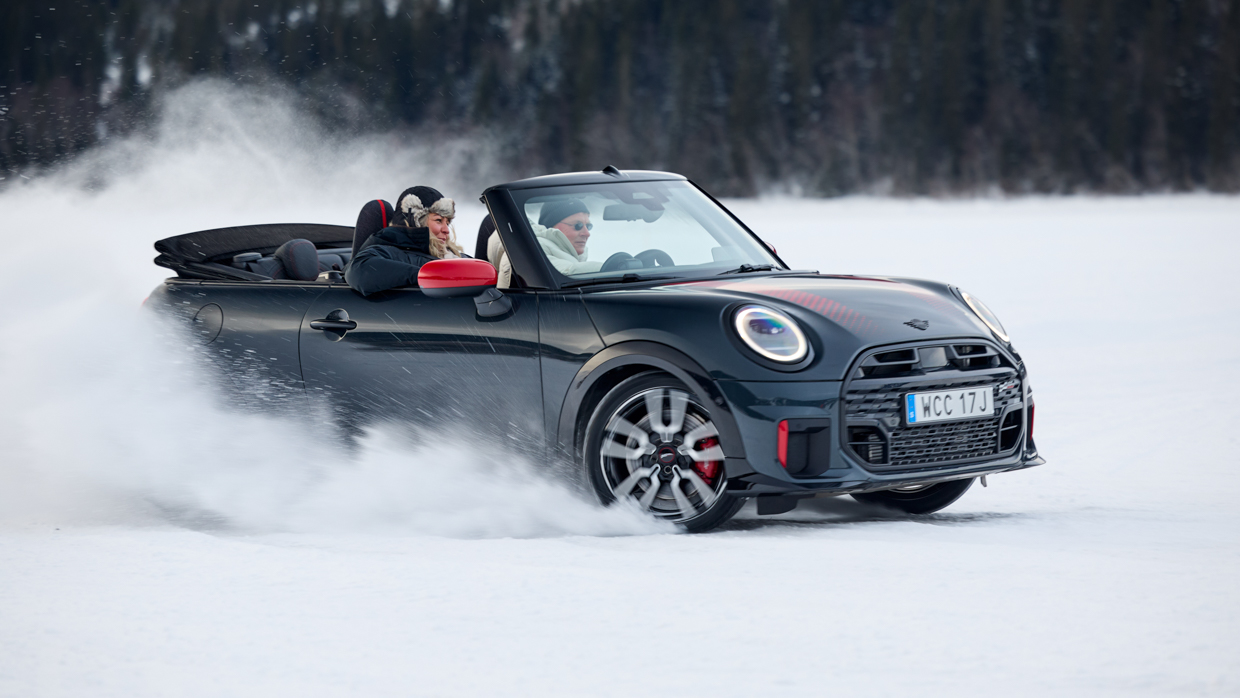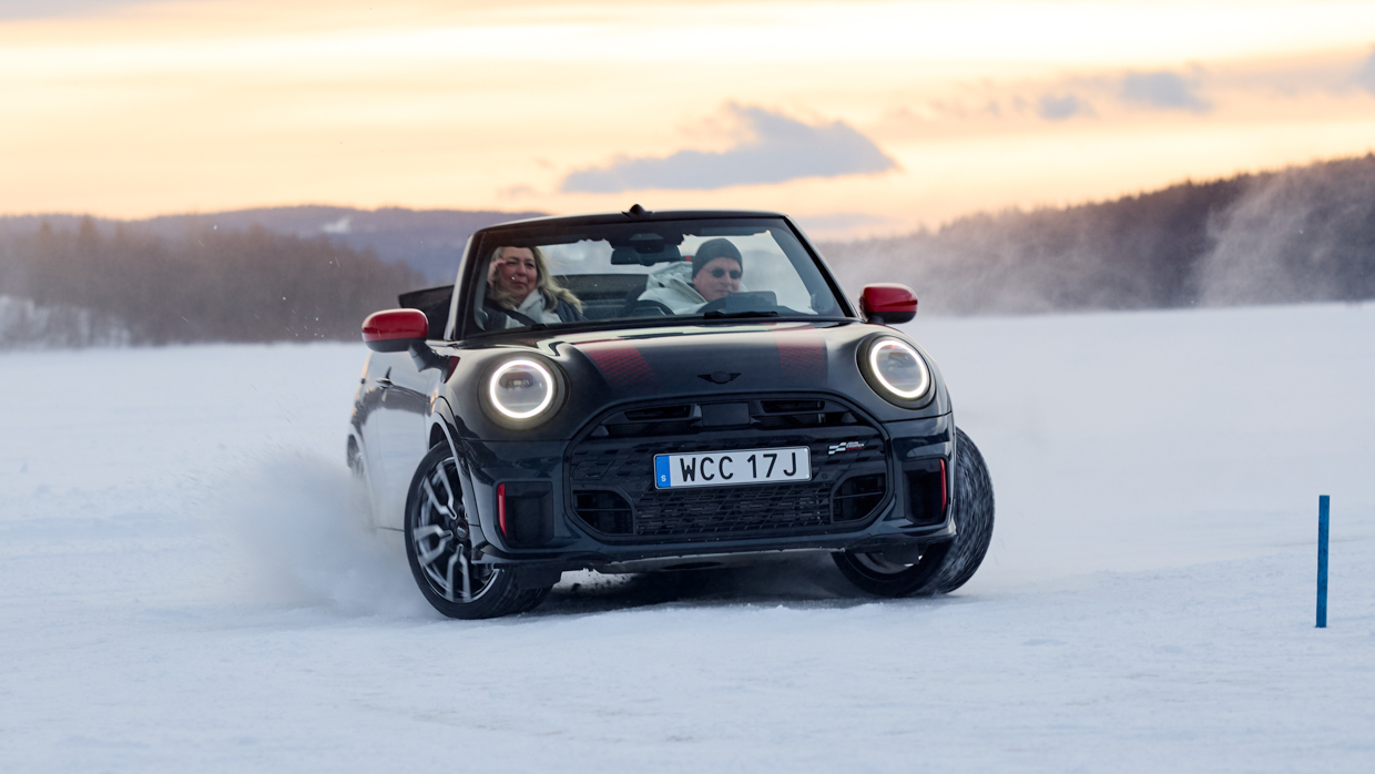 Wir sind in Åre, Schweden, der Heimat des größten Skigebiets Skandinaviens, um mit dem Mini Cabrio auf Eis zu fahren Cooper S bevorzugt und sportlich John Cooper Works (JCW) Verkleidungen. Relevanz für die reale Welt? Minimal für einen Australier. Aber es ist eine gute Ausrede, um das Fahrverhalten und den Einsatz bei kaltem Wetter des Mini auszuprobieren und seine Fähigkeiten in einer sicheren Umgebung zu verbessern.
