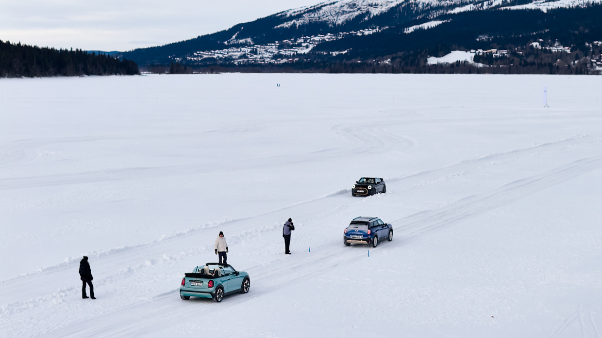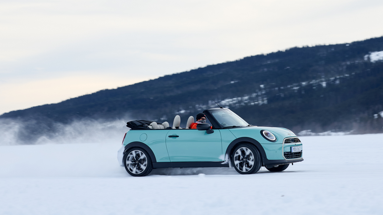 Für eine zusätzliche Herausforderung versuchen wir es mit deaktivierter Stabilitätskontrolle. Es fühlt sich entmutigend an – 70 km/h auf Eis sind schnell! – und doch sorgen die natürliche Balance, der niedrige Schwerpunkt und das vorhersehbare Fahrverhalten des Mini dafür, dass das Auto auch bei deaktivierten Systemen flach bleibt, größtenteils die Kontrolle behält und am Ende nur einen Hauch schiefer fährt als bei aktivierten Systemen.