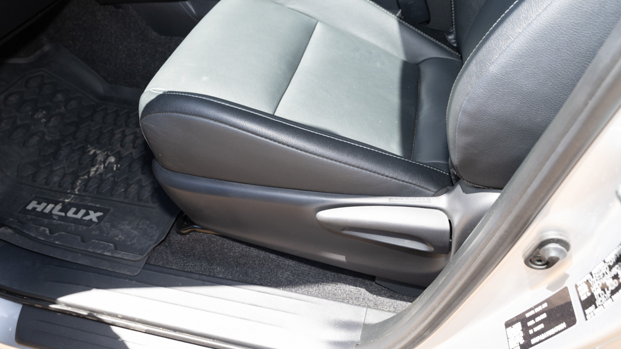 Die Kabine des Hilux ist schmal, was bedeutet, dass breitere Rahmen von beiden Seiten hineingequetscht werden, obwohl die Armlehnen zumindest mit einer schönen Lederpolsterung versehen sind, was es eher gemütlich als eng macht.