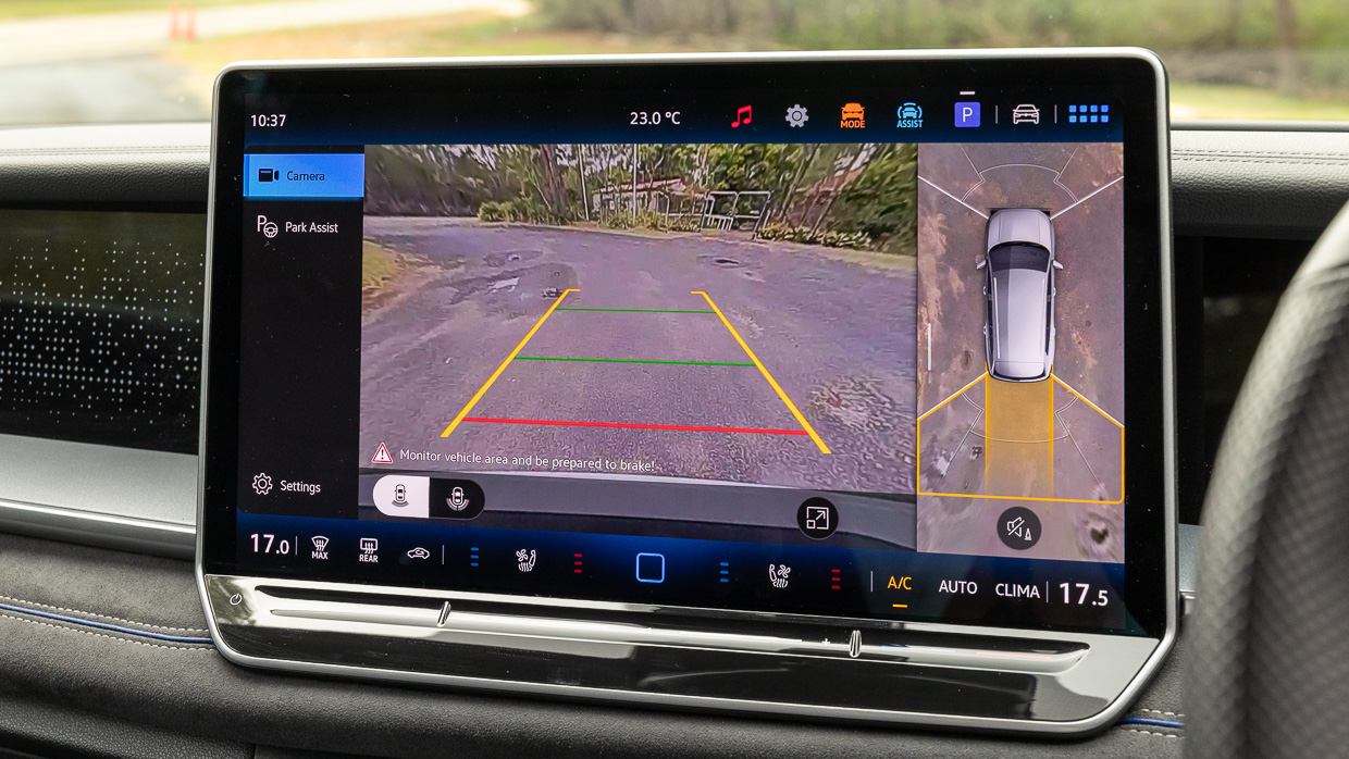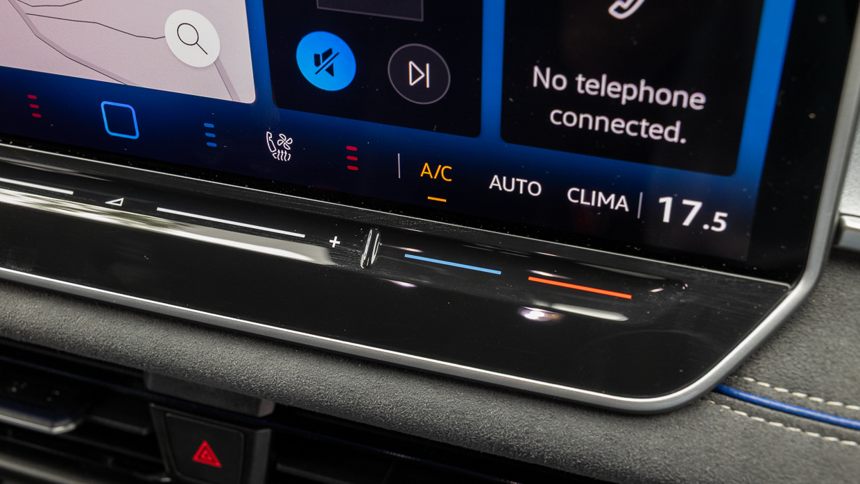 Die Benutzerfreundlichkeit ist im Allgemeinen eine Verbesserung gegenüber dem, was wir beim Mk8 Golf gesehen haben, dank eines großen, hellen 15,0-Zoll-Touchscreen mit beleuchteten Temperaturreglern unten und permanente Klimatisierungsfunktionen (Umluft, Automatik, Klimaanlage) auf dem Bildschirm, auch bei drahtloser Spiegelung von Apple CarPlay oder Android Auto.