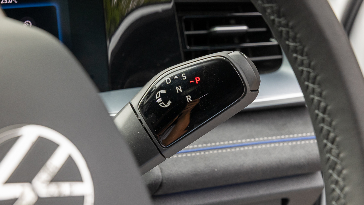 Die neue, von Elektrofahrzeugen inspirierte Steuerungsanordnung von Volkswagen im Tayron ist gewöhnungsbedürftig. Die Gangwahl erfolgt über den rechten Hebel, während der linke mit Blinkern, Scheibenwischern und Fernlicht ausgestattet ist.
