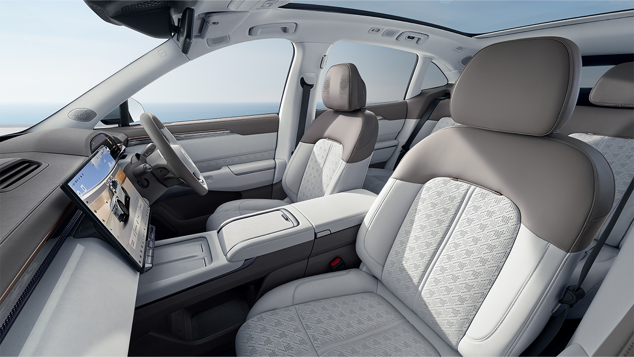Im Inneren ist schwarzer Vinyl Standard, wobei die RWD -RWD -Langstrecke abholt abgekühlte Sitze sowie die weitere Option einer schwarz/dunkelgrauen Innenstadt. Die Performance AWD hat Nappa -Leder Sitzgelegenheiten in Schwarz, Schwarz/Grau oder Lila/Weiß erhältlich.